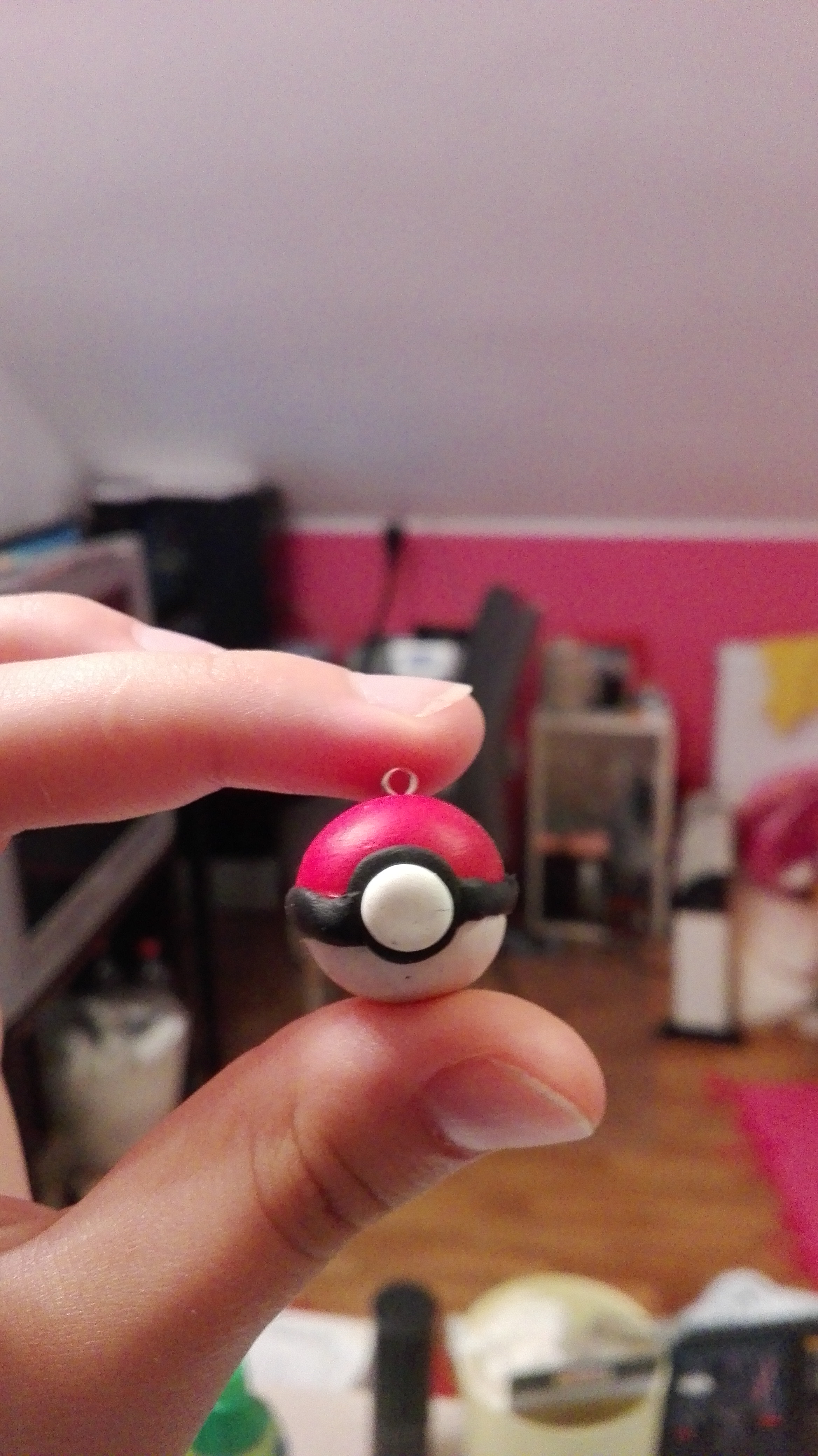 Vytvořen z polymerového jílu Cernit a FIMO, následně upečen v peci. Tyto polymerové jíly nezapáchají, jsou hladké na dotyk a jsou lehké, ale zároveň nejsou křehké, tudíž se nemusíte bát, že pokéball rozbijete :).